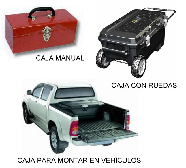 - Cajas para montaje en vehículos: para aquellos que se desplazan en camiones, camionetas o tractores de un lugar a otro, ya sea en obras de construcción, minería, agricultura o trabajos en rutas que cubren largas distancias, los baúles que se atornillan a la caja del vehículo brindan una mejor alternativa para almacenar las herramientas de manera segura, en lugar de tenerlas sueltas y esparcidas. En realidad, se trata de cajas estacionarias, pero desde el momento en que pueden desplazarse en un vehículo, las incluimos en este grupo. Este tipo de cajas son costosas, muchas vienen específicamente diseñadas para la marca y modelo del vehículo, y generalmente están construidas en acero, aunque también vienen de plástico de alta resistencia y baja tendencia a la deformación, capaces de soportar temperaturas ambientales extremas. Las ventajas de estas cajas se traducen en su gran capacidad para guardar herramientas, las cuales pueden transportarse a cualquier parte que vaya el vehículo, pero no es sencillo desmontarlas.