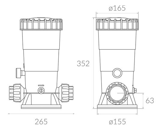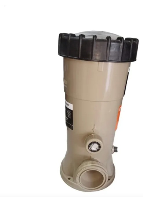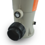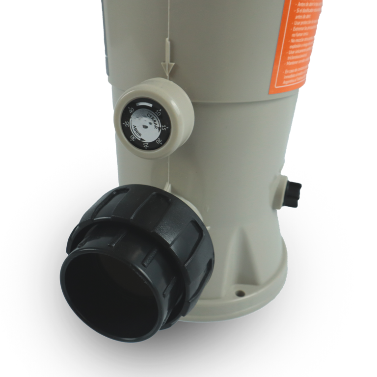 Dosificador de cloro Vulcano con capacidad de 2,6 kg de carga total, para pastillas de disolución lenta de 50 y 200 g. El equipo funciona en conjunto con el sistema de filtración de la piscina, conectado en línea al circuito de retorno, para dosificar el cloro durante varias semanas sin necesidad de recarga, logrando una dispersión uniforme a todo el volumen de agua.