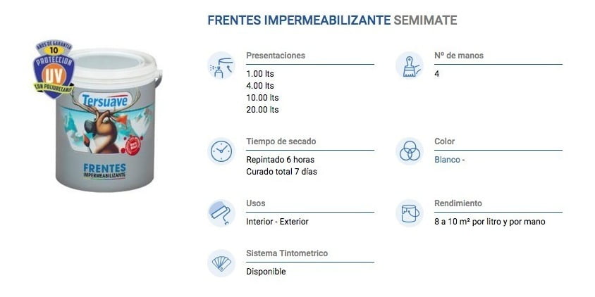 Si existieran imperfecciones menores, repararlas con Enduido Exterior Tersuave, aplicado en capas finas. Pintar 2 a 3 manos de Tersuave Frentes con un secado de 4 hs entre ellas, diluyendo hasta con un 10% de agua.