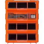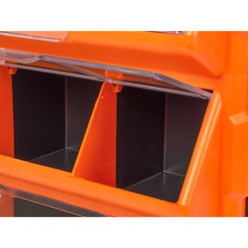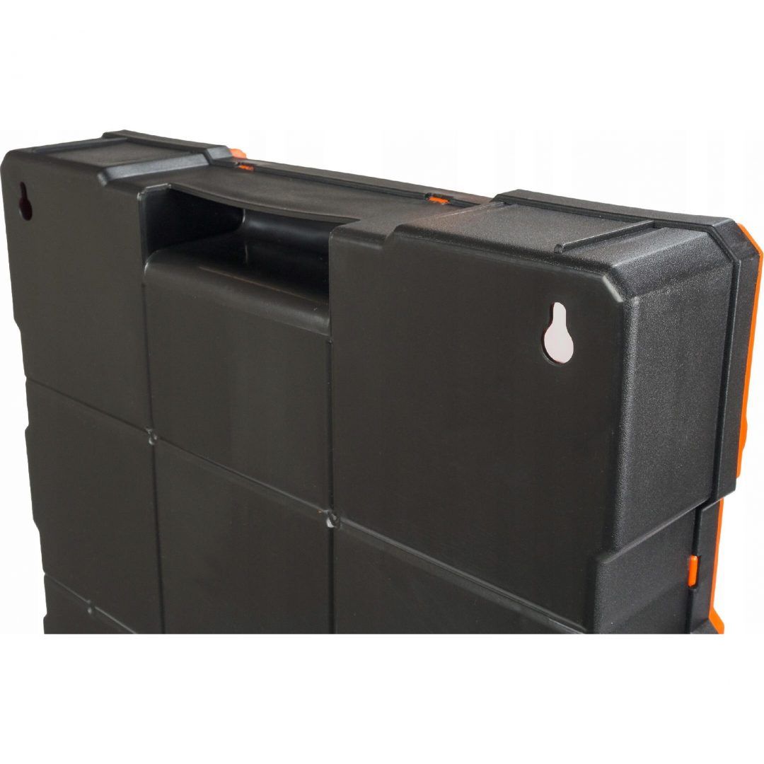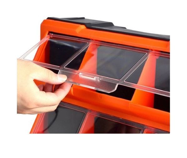 - Los compartimentos están cerrados gracias a la tapa transparente. Es una solución ideal para la separación y el almacenamiento seguro de pequeños accesorios, por ejemplo, tornillos, arandelas, accesorios eléctricos, componentes electrónicos o elementos de construcción de modelos en un taller, garaje o en casa.