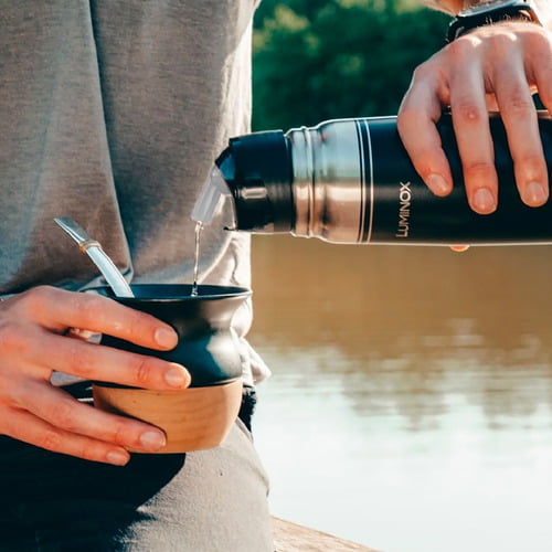 Su doble pared de acero inoxidable y el proceso de vacío exclusivo garantiza una alta performance del producto y asegura el mantenimiento de temperatura por muchas horas. Tapón para mate o café.